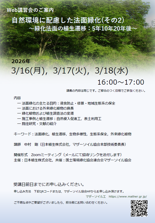 【勉強会】自然環境に配慮した法面緑化(その2) ~緑化法面の植生遷移:5年10年20年後~